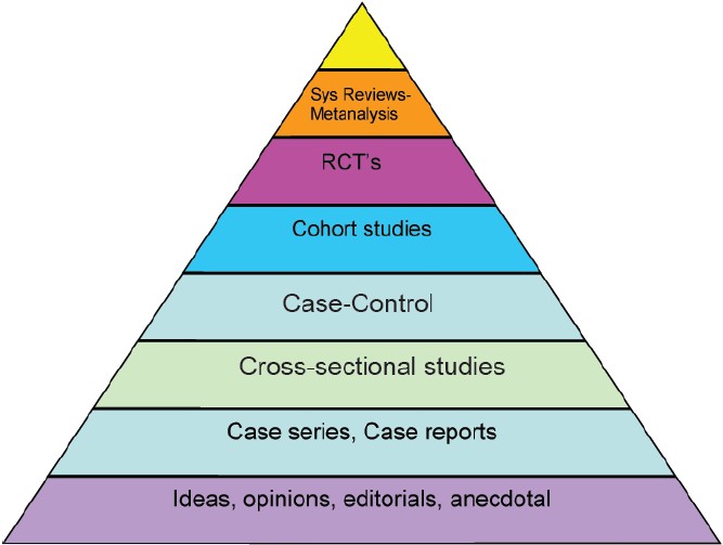 The ‘old way’ of thinking about the hierarchy of evidence was classically envisaged as a systematic review at the top, falling through RCT, cohorts and case-control to expert opinion (and below that, in some iterations, case law & legislative decisions).