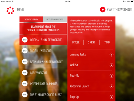 The original 7 Minute Workout section, initially described in the American College of Sports Medicine Health and Fitness Journal, consists of 12 exercises that alternate use of opposing large muscle groups to allow proper recovery for each group while continuing to work on a different group. These include jumping jacks, wall sits, push-ups, abdominal crunches, chair step-ups, squats, triceps dips on chair, planks, high knees running in place, lunges, push-up and rotations, and side planks, executed as 30 second intense intervals with 10 second rest periods between exercises.1The Smart Workout feature gauges user’s fitness and motivation level and creates a variety of custom workouts designed specifically for each trainee, targeting multiple focus areas and workout intensities. The Workout Library section allows users to choose between 22 pre-set workouts, varying in intensity (easy to hard) and duration (7 to 32 minutes), which are designed to fit their schedule.