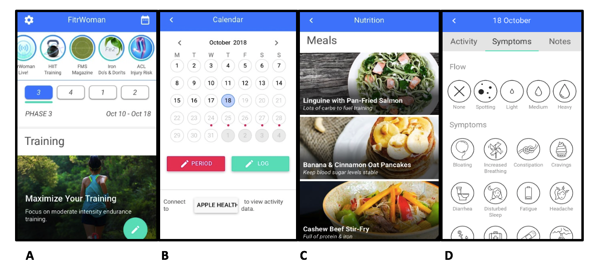 Figure 1 Screenshots of FitrWoman app user interface, showing, (A) Home screen; (B) The personalized calendar interface to track users menstrual cycle; (C) The nutrition interface showing recipes to help reduce symptoms and support training and recovery throughout the users menstrual cycle, (D) The activity and symptom log interface.