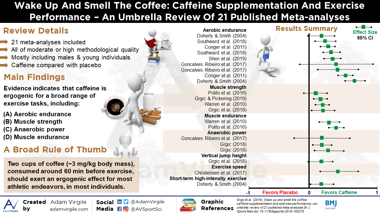 The infographic below is based on this FREE BJSM Review: Wake up and smell the coffee: caffeine supplementation and exercise performance—an umbrella review of 21 published meta-analyses.