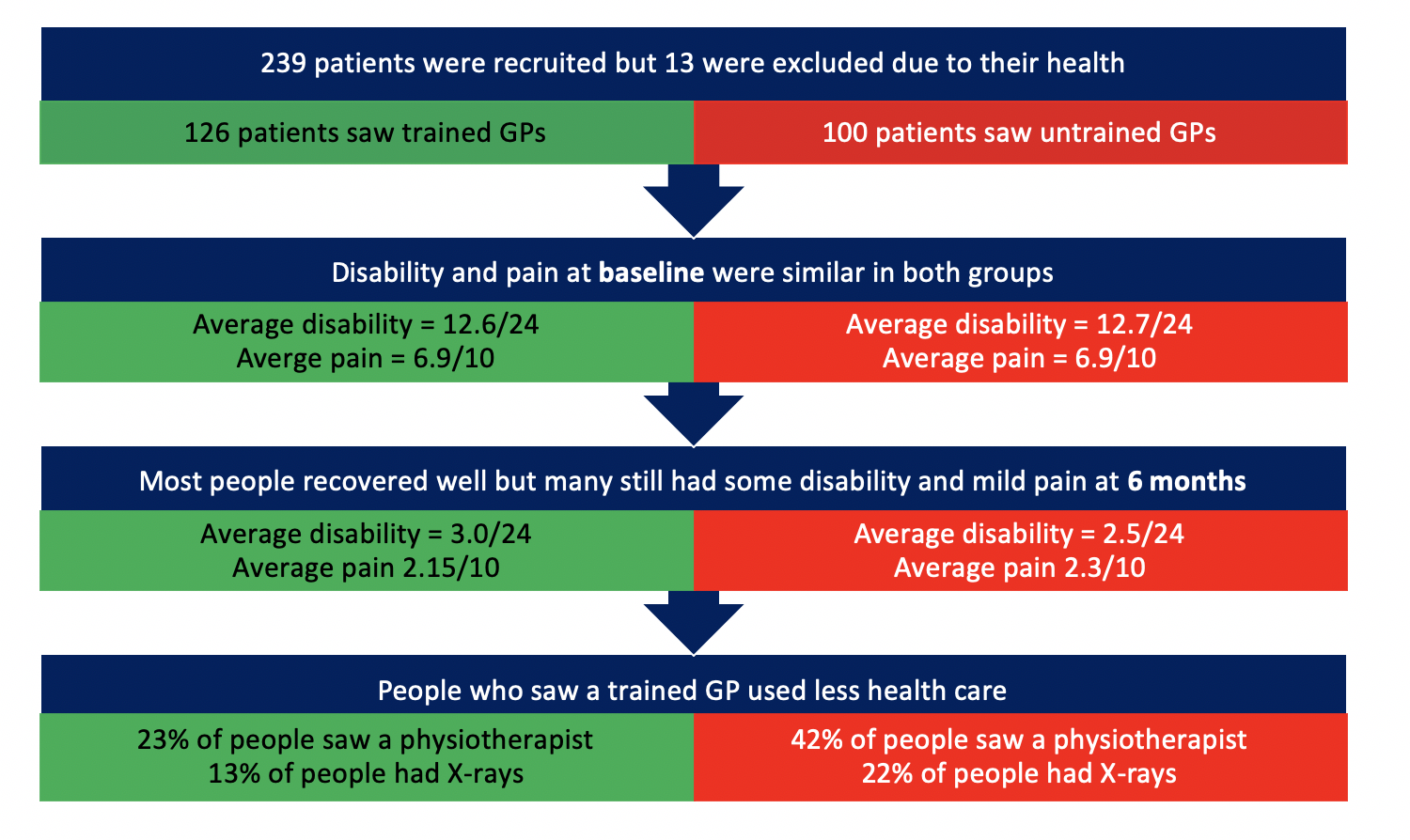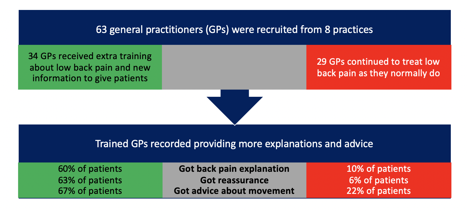 A common view is that GPs do not add much value to back pain care, but in reality GPs are very good at supporting people to manage psychological and social influences on their health. As these factors are key predictors of recovery from back pain, we wondered whether we could empower and support GPs to use these skills to improve back pain recovery?