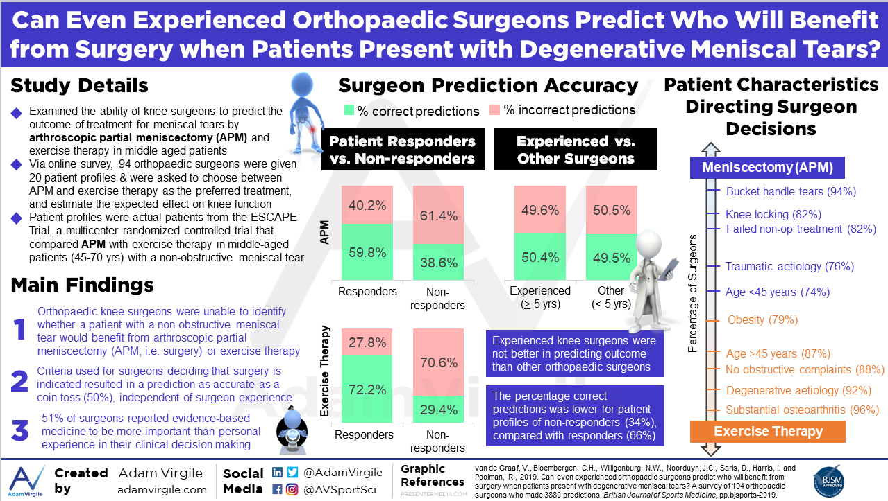 The infographic below is based on this Original Aritcle, published last year in the BJSM (Open Access): Can even experienced orthopaedic surgeons predict who will benefit from surgery when patients present with degenerative meniscal tears? A survey of 194 orthopaedic surgeons who made 3880 predictions