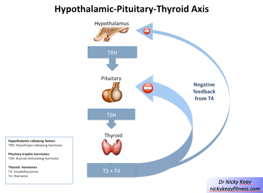 “Non thyroidal illness”/ “sick euthyroid” is characterised by low-end range TSH and T4. In other words, the negative feedback loop to maintain hormone homeostasis is not functionally normally. This situation is seen in functional hypothalamic-pituitary-endocrine gland suppression: for example, in athletes and dancers with the clinical syndrome of RED-S. In female athletes RED-S often presents as functional hypothalamic amenorrhoea, with low FSH and LH (in the presence of normal prolactin) and low oestrogen. As part of the adaptive response to the situation of low energy availability, metabolic rate is down-regulated to “save energy” ([viii]) characterised by low-end range TSH, T4 and T3 ([ix]). In such a situation, giving exogenous thyroxine will override this physiological response to down regulate metabolic rate and potentially increase energy deficit.