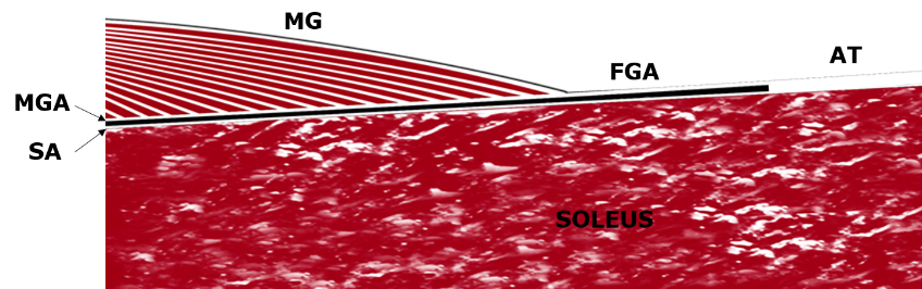 Fig. 1. Anatomical schema of the MG region. MGA (Medial Gastrocnemious Aponeurosis); SA (Soleus Aponeurosis); FGA (Free gastrocnemious Aponeurosis); AT (Achilles tendón).