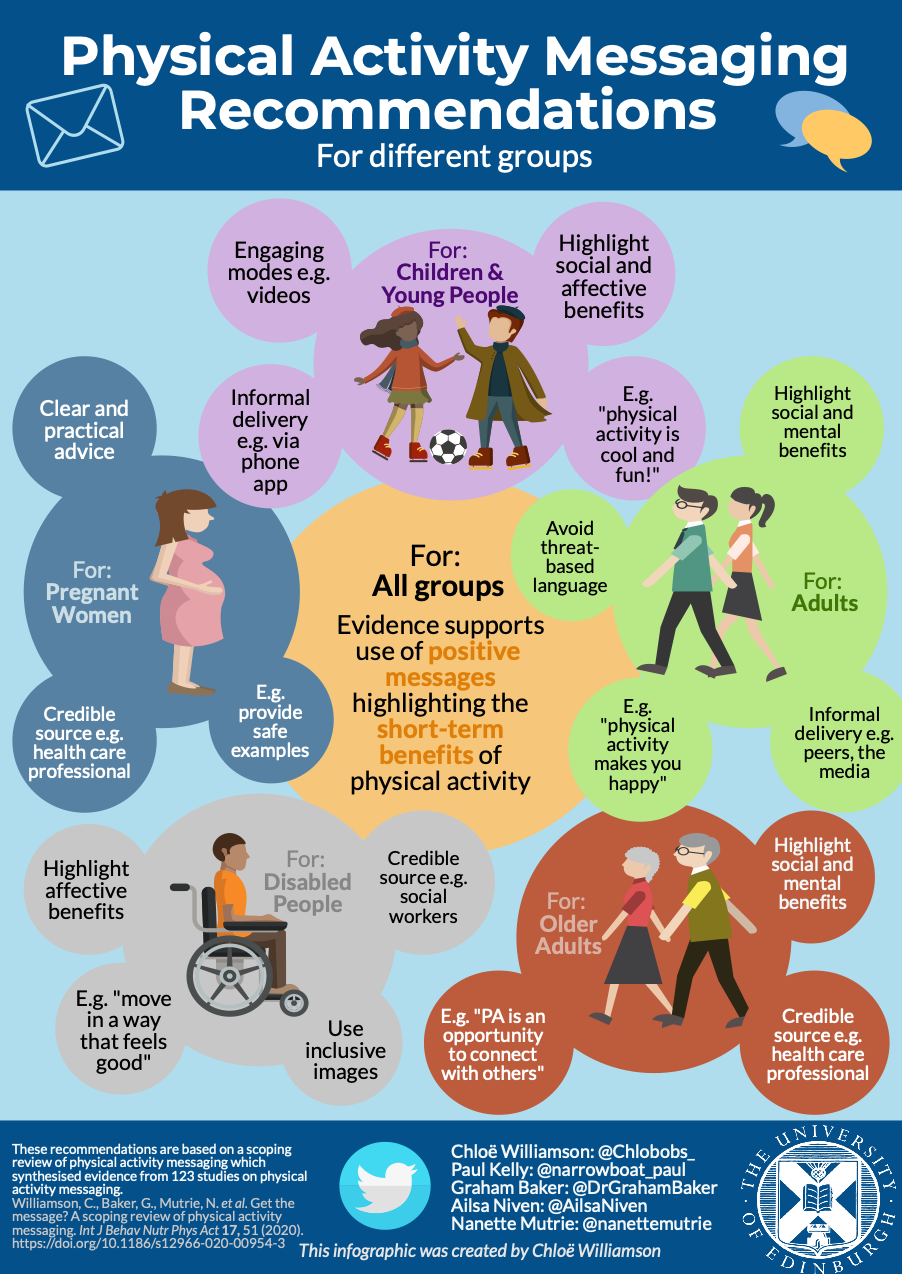 Our recent scoping review of physical activity messaging [4] reviewed and summarised 123 studies and provided recommendations for physical activity messaging to different population subgroups. A key finding which was consistent across all populations groups was that physical activity messages should highlight the benefits of physical activity (rather than the consequences of inactivity), particularly the short-term mental and social health benefits. For older adults, this may mean highlighting physical activity as an opportunity to spend time with loved ones. For children, they may mean promoting physical activity as fun and cool. For disabled people, this may mean promoting physical activity as a way of feeling good. We are currently in the process of gaining expert feedback and consensus on these principals to develop a user-friendly framework [5] for creating (and evaluating) physical activity messages.