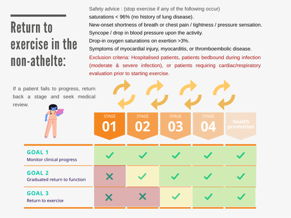 We propose a draft version of a 5-stage protocol to assist clinicians in returning patients to exercise. This protocol aims to bring together time and progress-based intervals during rehabilitation, alongside holistic advice to address; sleep, nutrition, social support strategies, and mental health complaints. Due to the complexity of rehabilitation needs in some subgroups of patients, we propose that the following groups of patients be excluded from the return to exercise protocol:
