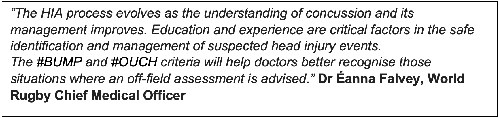 These data can be used to inform conversations around how the threshold for a HIA could be adapted to further enhance player welfare. Through collaboration between World Rugby, the RFU and Premiership Rugby, all matchday medical teams are being notified of these findings and are being encouraged to use the #OUCH visible or video criteria both as a guide to inform clinical decision making, as well as a ‘term of reference’ to guide communication between independent medics and team medics. The key practical take-home message is that should one or more #OUCH criteria be observed by team medical staff practitioners and/or seen on video, there should be a clear and logical medical reason present to over-rule the player being removed from play for the structured off-field HIA (e.g a player staying down due to limb trauma/being ‘winded’ as opposed to a head impact) rather than being assessed whilst still on the pitch. These criteria will also feature as a key term of reference in the standard post-match independent HIA review process, to ensure that the important lessons aren’t consigned to the pages of medical journals and guides.
