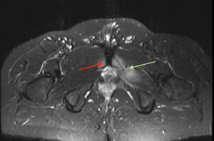Axial STIR image of the pelvis. Red arrow shows the bone marrow oedema present at the pubic symphysis. Green arrow shows the adductor muscle oedema.