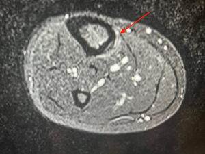 Axial STIR sequences of the tibia and fibula. There’s an increased fluid signal adjacent to the tibia, as shown by the red arrow. This scan shows a slightly atypical appearance, as the oedema is advancing to the posterior aspect of the tibia.