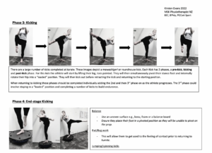 Karate encompasses many kicking techniques. The strength and mechanics required to execute these is variable between Karate athletes and type of kick. Given the variability, the below exercises should serve as a base for returning to kicking. Each exercise can be adapted to individual kicks your Karate athlete will be returning to. Normal joint mechanics should be restored prior to commencing this programme and global strengthening of gluteal and other support muscles as per normal rehab guidelines would continue alongside.