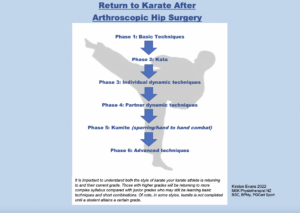 At the time of my hip surgery no-one was able to comment on my ability to return to Karate or kicking. Literature exploring the physiotherapy rehabilitation of Karate athletes after arthroscopic hip surgery was also scarce. The lack of literature and the collaboration needed during the rehab and return to sport (RTS) phase of my recovery highlighted the gap in RTS knowledge for Karate athletes among clinicians. Given the significance practicing Karate holds to those that engage in it, I have created the following guide to assist clinicians on returning their athletes both to kicking and to Karate after their injury. My hope is that this blog can help to close the gap.
