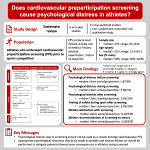 Cardiovascular preparticipation screening (PPS) is routinely practiced across the globe and supported by numerous international medical societies. Despite its widespread use, the connection between cardiovascular and psychological health, and more specifically, the mental toll that screening has on athletes, is rarely considered by health care professionals involved in the cardiovascular care of athletes. In this blog we will highlight our systematic review (recently published in BJSM), which summarized the existing literature on the psychological implications of PPS (1).