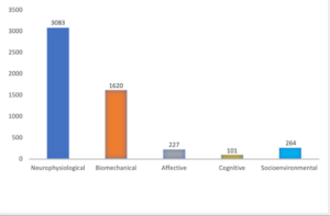 Most studies included assessment tools from the two traditional domains: neurophysiological and biomechanical. All studies included neurophysiological (location, severity, impact of pain on performance etc) and biomechanical (training load, height and weight, range of motion, strength etc) assessment tools were included in 90% of studies. In contrast to this, socioenvironmental (time of season, quality of life etc) assessment tools were included in 39% of studies, whilst affective (confidence to return to play, feelings/emotions, concerns/worries about pain etc) assessment tools were present in 22% of papers and tools from the cognitive (attention/distraction, pain beliefs, pain catastrophizing etc) pain assessment domain were found in just 13% of studies included. Looking at the total number assessment tools used in each domain (as many studies included multiple tools from the different domains), the gap between the 5 domains increased even further. Neurophysiological and biomechanical tools were used far more frequently than affective, socioenvironmental and cognitive tools which can be viewed below (Figure 2).