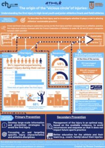 It is well known that training and competing in athletics (track and field) leads to a risk of injuries (2). Athletic performances can be affected by these injuries, as well as short and long term consequences with health. This can lead to drop out in athletics (3,4). Therefore, reducing injury risk represents a priority to allow both sustainable and healthy athletic practice and the best level of performance.