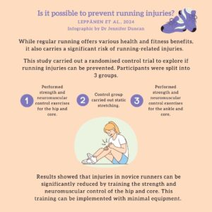 - Leppänen M, Viiala J, Kaikkonen P, et al. Hip and core exercise programme prevents running-related overuse injuries in adult novice recreational runners: a three-arm randomised controlled trial (Run RCT). British Journal of Sports Medicine 2024;58:722-732.