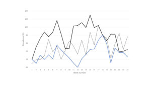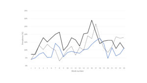 Figure 5. Prevalence of substantial lower extremity (LE) overuse injuries in hip and core group (blue line), ankle and foot group (dashed black line), and control (black line) group during the 24-week study.