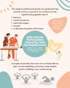 This study found that participation in high-intensity activity after THR does not appear to cause harm or increase the risk of complications over 10 years. Surgeons can caution patients that some high-impact activities might lead to more hip pain during activity, even if they don’t cause long-term problems.