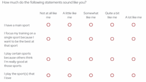 However, we believe that the behavior of youth sport specialization includes social and motivational influences, in addition to physical demands, that lead athletes to participate in their main sport for most of the year. Additionally, asking athletes to answer several dichotomous questions may not be sensitive enough to accurately reflect small fluctuations in an individual athlete’s level of specialization over time. Therefore, our study aimed to develop a new questionnaire to accurately measure a youth athlete’s level of sport specialization, named the Wisconsin Sport Specialization Questionnaire (abbreviated WISSQ).