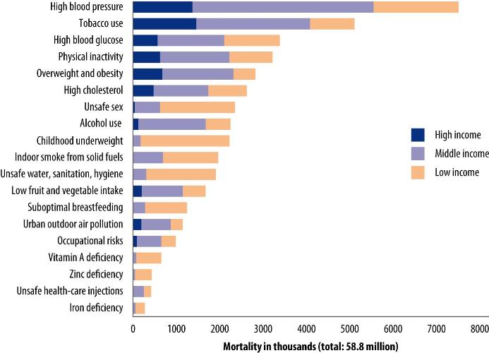 What do you think is the risk factor that causes the most deaths globally? Until I saw the data I’d have answered tobacco. But in fact it’s high blood pressure. As the figure (see below) shows, tobacco causes about six million deaths a year but high blood pressure around eight million. That’s why the Global Alliance for Chronic Diseases chose hypertension as its first target and yesterday announced its first awards for research in low and middle income countries.