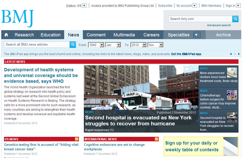 Finally, perhaps the main change we’ve made this year is the launch of online editions of BMJ USA and BMJ India. Lots of international news sites target their homepages to different countries or regions. We went one step further. Our four main content channels—research, news, education, and comment—now promote articles of particular relevance to readers in those countries. So a US reader’s default view of bmj.com is the US edition (see the US news channel, below), but he or she can also flick to the international. UK, or India versions. We know our readers are interested in healthcare from other countries, so we also provide feeds of articles of international relevance on these channels. We also launched a UK edition, which enables us to promote articles about the NHS and BMA that we know have limited appeal outside the British Isles. One advantage of these country windows is the ability to display which articles are popular in those countries, so they all have feeds showing “most read/shared in the UK/US/India.”