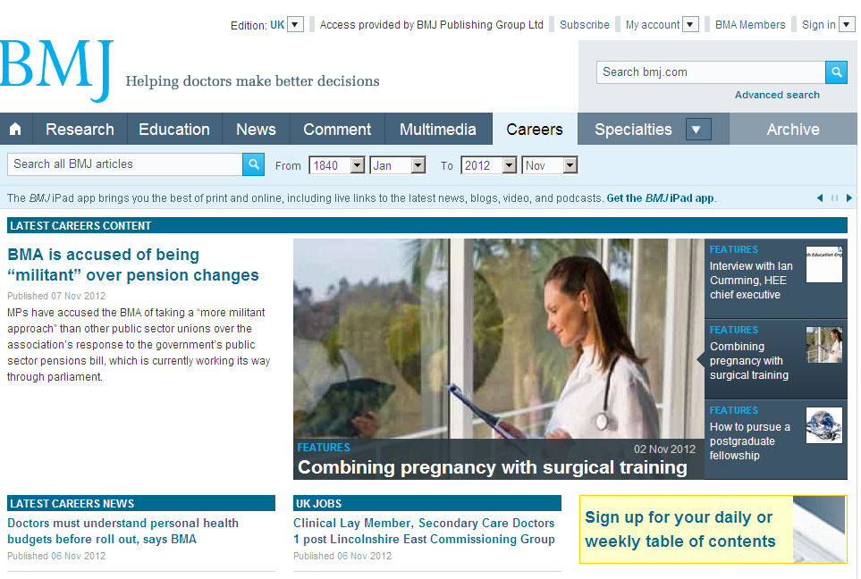 You will still find links to these on other pages, and they can all be accessed from a new BMJ Group global navigation bar (see above), which went live a few months ago. And in the case of Careers, we introduced a new careers channel on the main navigation bar last month. This new channel (see below) pulls in the latest careers news articles and features, and the latest UK and international jobs.