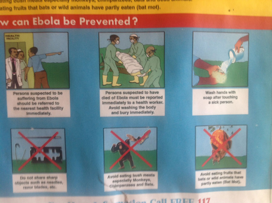 Public health messages and precautions continue throughout the city: big posters announcing that “Ebola is Real so ABC: Avoid Body Contact!” dominate the main thoroughfares. Chlorine handwashes are at the entrance to restaurants and supermarkets—but even so, I’m careful not to touch the doors with my hand. Even as medics, we have never been so clean, so hygiene aware. And we’re all getting acclimatised to the no touch policy: no touching even among the team, no handshaking when you meet someone. Instead, a crossed arm against your chest.