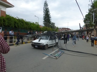 We realized that we needed to stay in an open area away from high buildings and electric pylons so we walked up to the main intersection between New Road and the Garden of Dreams. Here we joined hundreds of others—both locals and tourists, gathering around a forlorn policeman who had been directing the traffic. When the first aftershock came we found ourselves linking arms in a circle with others including a Spanish couple who had come to an international tatooing conference. Experiences like this link people together, sometimes literally, when ordinarily they would have nothing in common.