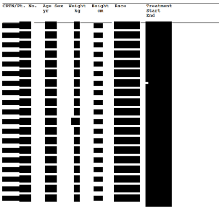 Figure 2: Line listing from Tamiflu trial WV16277 (Research Report No. 1005291) redacted according to the TransCelerate guidance. Available from http://dx.doi.org/10.5061/dryad.77471