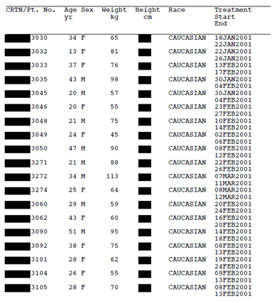 Figure 1: Line listing from Tamiflu trial WV16277 (Research Report No. 1005291) redacted by Roche for public release. Available from http://dx.doi.org/10.5061/dryad.77471