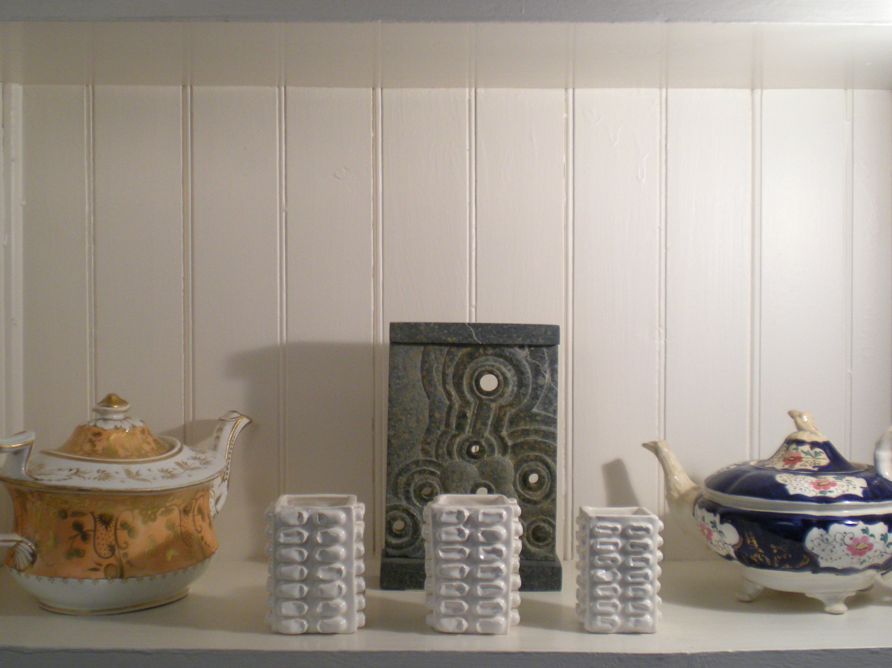 I began making ceramics just over ten years ago, as a counterpart to my main career promoting and creating opportunities for artists and architects. I quickly discovered the allure of casting clay in plaster moulds; first, the precision with which liquid plaster sets to a clean white negative shape, and then the way in which the liquid clay, poured into the plaster mould, takes on the form of the moulded shape and then pulls away to become the final cast object. Firing and glazing the clay form then sets the object into an almost indestructible state.