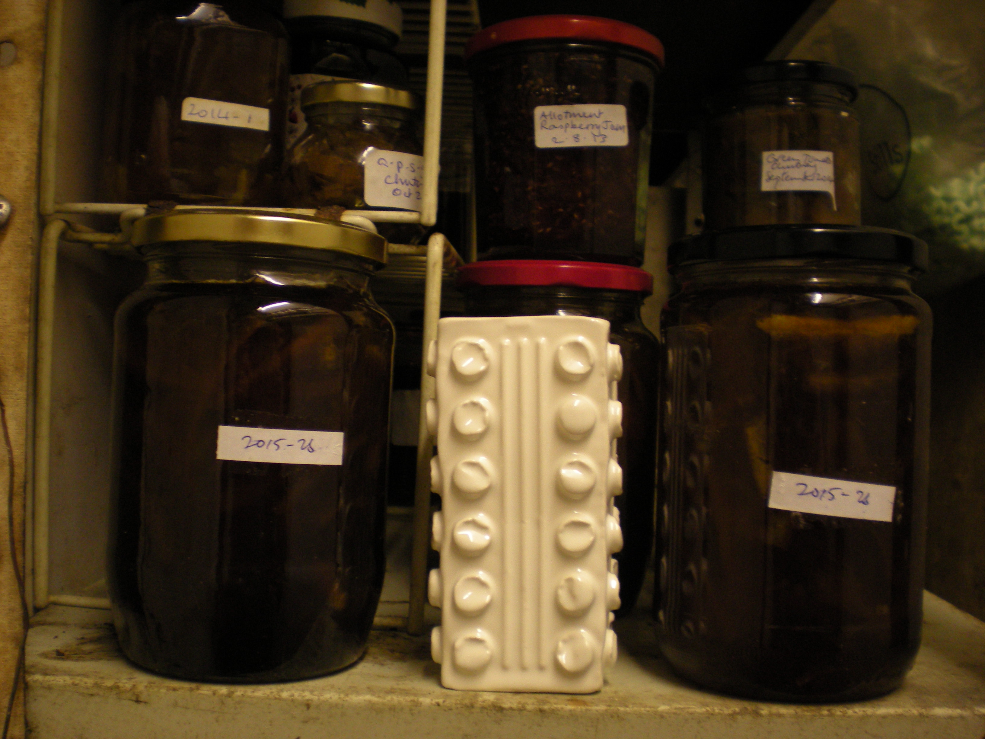 The 34 earthenware pots, finished with a glossy tin white glaze, encompass the run-of-the mill regulars of paracetamol and ibuprofen, occasionally used herbals such as echinacea and valerian, and holiday preventatives such as atovaquone/proguanil hydrochloride. Several different prescriptions of flucloxacillin and amoxicillin arrived with a bout of cellulitis in 2012, and a diagnosis of Parkinson’s Disease in 2011 has occasioned a range of pots celebrating various strengths of ropinirole and levodopa/carbidopa. The pots were first exhibited in the Edinburgh Central Library in June 2015.