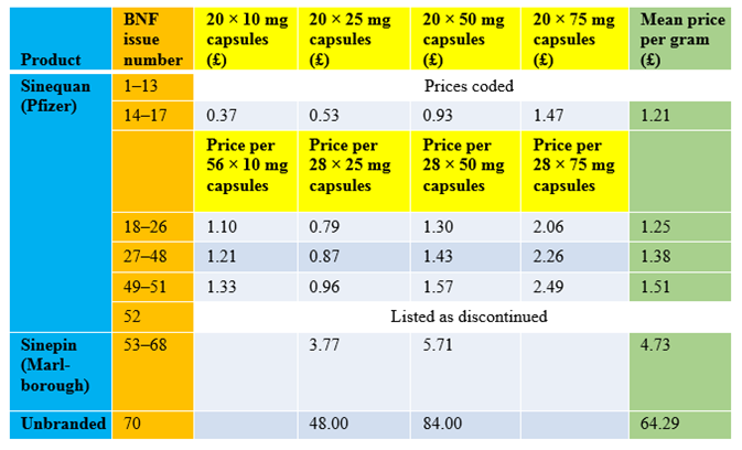 Table: Changing prices of doxepin, as listed in print issues of the BNF
