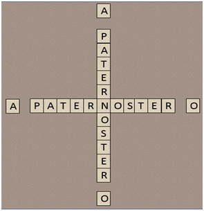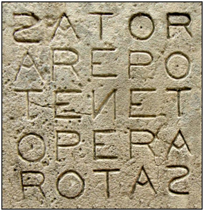 An ancient word square, which reads “Sator Arepo tenet opera rotas”, translated as “The sower Arepo holds the wheels with care” or “The sower Arepo holds wheels at work”. The earliest version was found on a column near the amphitheatre in the ruins of Pompeii. Other interpretations have been suggested, and it has been anagrammatized into the cross on the right, two paternosters each flanked by an alpha and an omega.