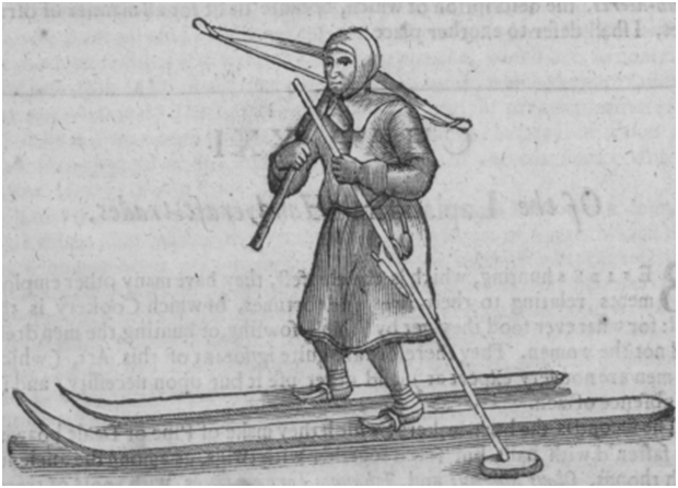 A Laplander on skis, as illustrated in the English edition of The History of Lapland (Oxford, 1674; XX: 98–100) by John Scheffer, Professor of Law and Rhetoric in Uppsala. “I come now to their other instruments relating to this sport [i.e. hunting], the chiefest of which are their shoes, with which they slide over the frozen snow, being made of broad planks extremely smooth; the Northern people call them Skider, and by contraction Skier (which agrees something with the Germans Scheitter, that is, cleft wood and sometimes Andrer or Ondrur or Skidh).”