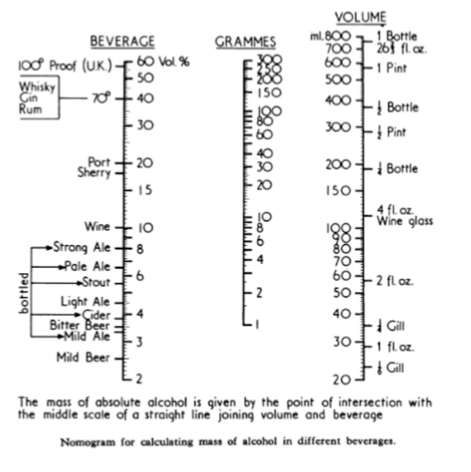 It is useful to know a little about the pharmacokinetics of alcohol. It is well absorbed throughout the gut, including the stomach. The rate of absorption depends on the concentration, with a maximum at about 15%, and is delayed by food. So if you want to get drunk quickly, take your gin with tonic or your whisky with Highland spring water (but not if it’s a high class malt—that would be sacrilege) and do it on an empty stomach. Alcohol is metabolised by alcohol dehydrogenase to aldehyde, which is metabolised to CO2 and water by aldehyde dehydrogenase. Women have less alcohol dehydrogenase in their stomachs than men, and so more alcohol enters the systemic circulation. They also have a lower apparent volume of distribution, so their blood alcohol concentration is higher at any dose. The consequences of these differences are obvious. Elimination is slow, about 6 g/h, and you can still be over the legal limit for driving the next morning after a heavy night. To do the calculations, use the nomogram below, but remember that wines are stronger these days. Alcohol is distributed in body water, which has a volume of about 40 L/70 kg, so to calculate the approximate blood alcohol concentration in mg/dL (mg%) divide the amount of alcohol in the body in grams by 0.4.