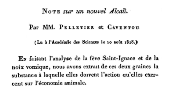 Discovery of strychnine by Pierre-Joseph Pelletier (1788–1842) and Joseph Bienaimé Caventou (1795–1877) in the Saint Ignatius bean (Strychnos ignatia) and Strychnos nux vomica