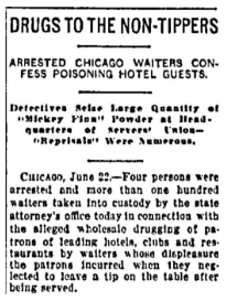 The Chicago restaurant poisonings, in which customers who tipped poorly were given antimony potassium tartrate (tartar emetic) in their food or drink; the mixture was called a Mickey Finn