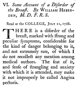 William Heberden coins the term “angina pectoris” in a lecture at the Royal College of Physicians