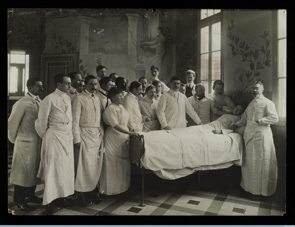 - A crowd of medical staff standing round a woman patient in bed in a hospital ward. Murals of foliage and allegories painted on the walls. Photograph 20th century. By: and Seeberger Freres Published: c.1910. Printed: France Copyrighted work available under Creative Commons Attribution only licence CC BY 2.0, see http://creativecommons.org/licenses/by/2.0/