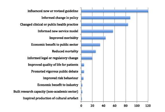 - No evidence yet of benefit to health but, for example, research is included in guidelines or has led to a change in government policy that has yet to be shown to have an impact on health
