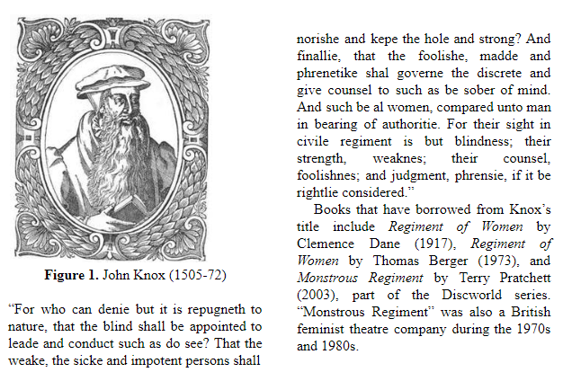 Take the triplet regime, regimen, and regiment, a closely linked group. A regime is a manner or system of rule or government, these days often used disparagingly. A regimen is a course of diet, exercise, or other form of behaviour designed to improve your health, and it can also refer to drug therapy. Clinical pharmacologists prefer “regimen” to “regime” in referring to a course of treatment. It is certainly desirable to distinguish the two words, but historically things are not that simple. Regime and regimen originally meant the same thing, and neither referred to medical treatment. Since the Earl of Carlisle, in 1776, illustrated the distinction, writing that “regime is better than physic”, the meanings of the two words have diverged, although without departing too far from each other. They are still used, for example, apparently interchangeably, by geographers to describe the condition of a watercourse. A regiment is not only a body of soldiers, but also a regime. So when John Knox wrote his pamphlet The First Blast of the Trumpet Against the Monstrous Regiment of Women (1558), he was thinking, not of a troop of marching harridans, but of government by women, which he may have thought a much more frightening prospect altogether (Figure 1). Regiment once also meant a regimen, as in the phrase “a regiment of health”. In fact, in some senses regiment meant regime and regimen before regime and regimen existed. So the three words all really mean the same thing.