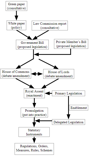 When a law is drafted it will, or should, be good for the time being. In order to allow the law to be amended in response to needs that cannot be anticipated when the original law is enacted, an original Act, whether drafted in broad or specific terms, may contain provisions that allow the enactment of so-called “Delegated Legislation” (Figure 2). Most such legislation consists of what are called statutory instruments, which include regulations, orders, measures, rules, and schemes. Statutory instruments can be recognized from having one of these words in their titles.