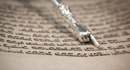 Figure 1. Reading the scroll of the Hebrew Torah with the help of a yad; the reader, who declaims the text aloud to the congregation, may hold the yad, or it may be held by a representative of the congregation, a segal, originally a deputy high priest; it is not permitted to touch the parchment, which makes one ritually impure and risks damaging either the parchment itself or the ink, which sits on the surface of the vellum; a typical yad is about 12 inches long and made of silver