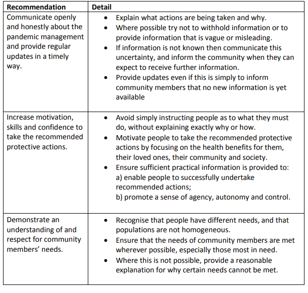Research on responses to public health emergencies has shown that people will cooperate to achieve common goals if they feel like they are part of a shared communal effort, and if they believe the people leading this effort are part of the same “community of circumstance” and are acting legitimately on their behalf. Providing clear, detailed information to justify recommended actions promotes trust that leaders and policymakers are acting in the common good, which increases motivation to support and engage with public health advice.