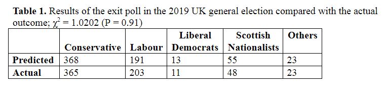 The results of the 2019 UK general election are shown in Table 1. The exit poll came as close as one could to the actual outcome without suspecting sorcery; the data were of high quality and the expected variability was well modelled, under reasonable assumptions.