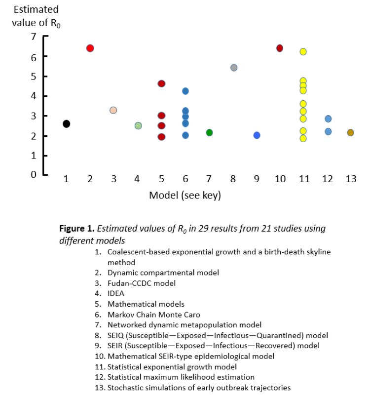 Thus, it has been exceedingly difficult to calculate accurately the reproduction numbers of SARS-CoV-2. Figure 1 illustrates this, with data taken from a systematic review of 21 studies, showing huge variation; the mean estimate was 3.32 (2.81–3.82) and the range 1.9–6.49.