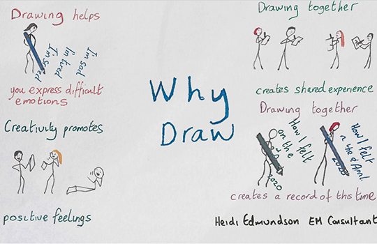 I ran weekly 20 minute sessions and used this time to remind everyone of what resources were available within the hospital. I also checked in on how everyone was feeling, inviting them to give me a number out of 10. Finally I asked everyone to draw how they felt.