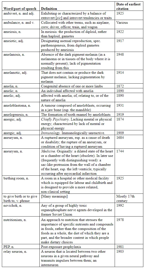 Table 1. Medical entries in the March list of additions to the Oxford English Dictionary