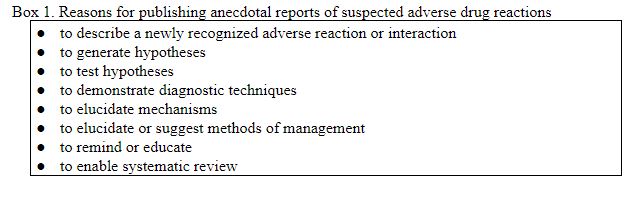Anecdotal reports have typically been regarded as evidentially the lowest of the low, barring expert opinion and mechanistic reasoning, neither of which is a form of evidence at all. Nevertheless, I have argued, thinking about adverse drug reactions and interactions, that there are several important reasons for publishing anecdotes (Box 1).