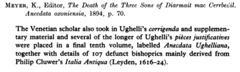 Bottom: From In Politics and Culture in Early Modern Europe. Essays in Honor of H G Koenigsberger. Edited by Phyllis Mack and Margaret C Jacob. Cambridge: Cambridge University Press, 1987: 227; Anecdota Ughelliana is the title of the volume that “the Venetian scholar” Nicolo Coleti added to Ferdinando Ughelli’s nine volumes of Italia sacra sive de episcopis Italae; Ughelli (1595–1670) was an Italian Cistercian monk